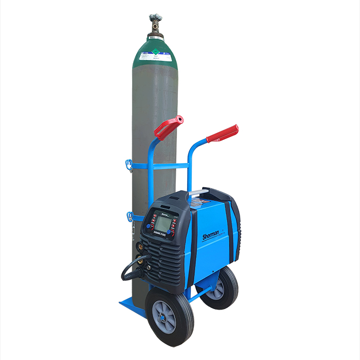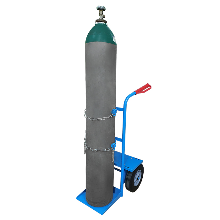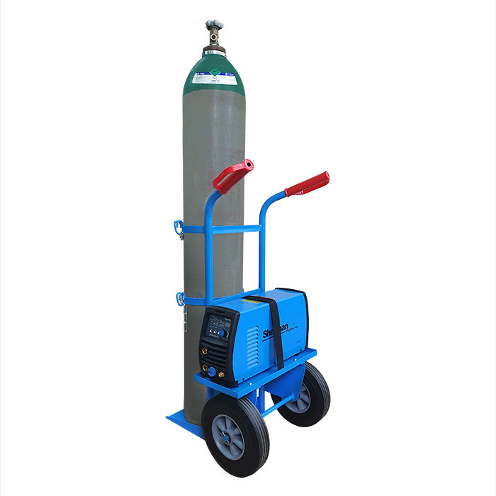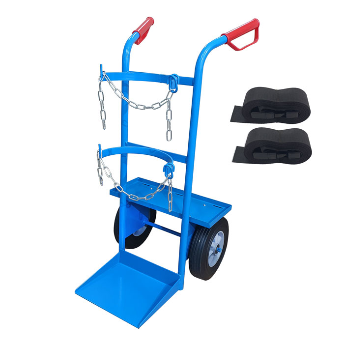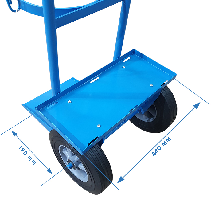Wózek do transportu butli z gazami technicznymi o pojemności od 8 do 50l. Wyposażony w półkę i pasy mocujące o regulowanej długości umożliwiające bezpieczne przewożenie spawarki lub innych akcesoriów spawalniczych.