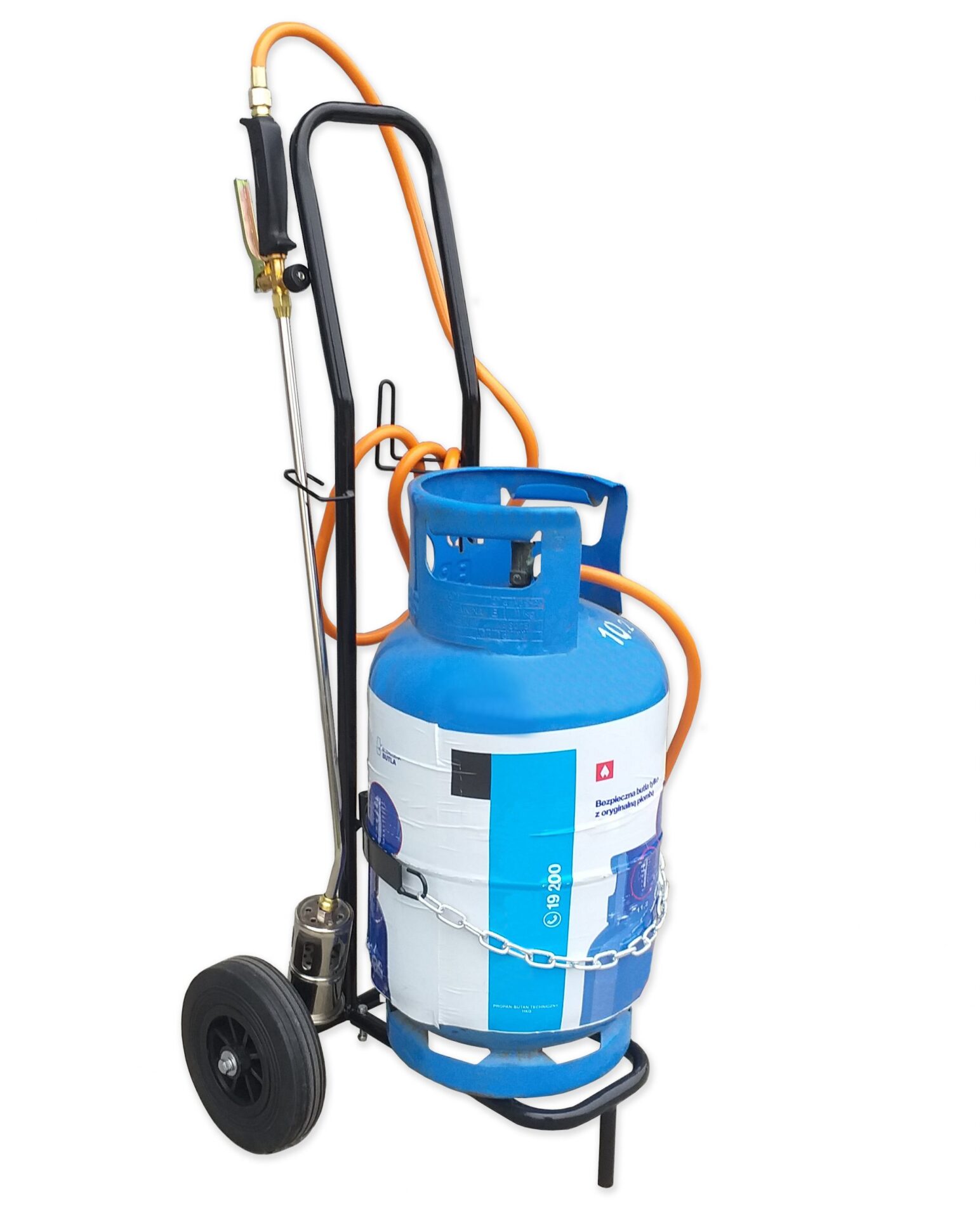 Lekki i poręczny wózek do transportu butli z propanem i mieszanką propan-butan 11kg. Dedykowany do zestawów do podgrzewania, umożliwia zawieszenie węży zasilających i odstawienie palnika podgrzewającego podczas przerw w pracy. wózek jest na kołach gumowych, niepompowanych.