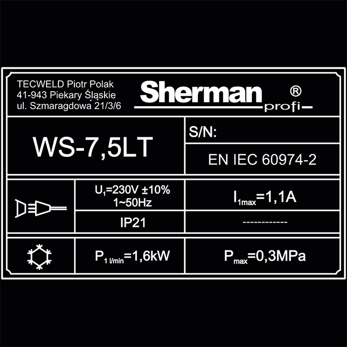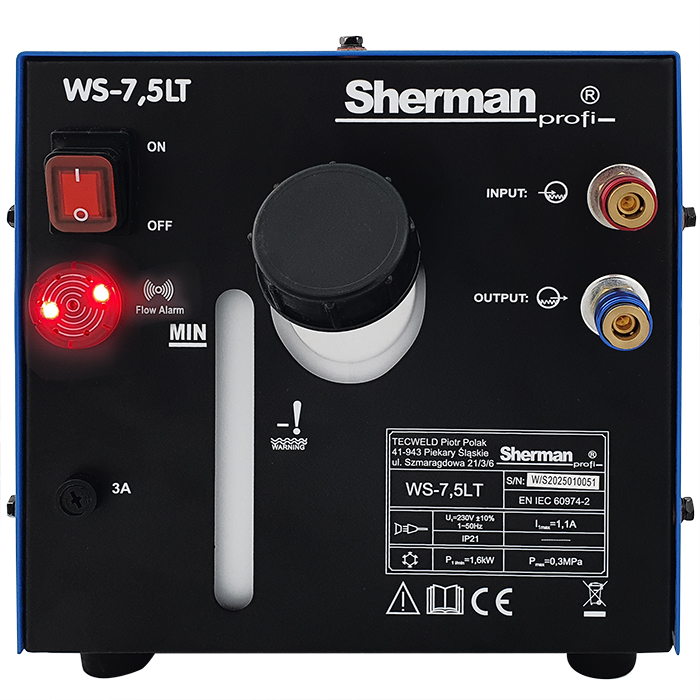 Chłodnica WS-7,5LT przeznaczona jest do chłodzenia cieczą uchwytów spawalniczych MIG/MAG, TIG oraz plazmowych lub innych urządzeń i podzespołów wymagających chłodzenia w obiegu zamkniętym. Chłodnica dedykowana jest do współpracy ze spawarką Sherman-profi TIG 320 AC/DC pulse, może także współpracować ze wszystkimi spawarkami Sherman oraz podobnymi urządzeniami innych firm. W jej budowie wykorzystano komponenty chłodnicy WRC-300B, zmianie uległa odbudowa oraz zbiornik płynu. Zastosowanie wymiennika ciepła zbudowanego na miedzianej wężownicy i pompy ze stali nierdzewnej zdecydowanie zwiększają skuteczność chłodzenia oraz przedłużają żywotność urządzenia. Chłodnica wyposażona jest w czujnik przepływu z alarmem wizualnym oraz dźwiękowym. Czujnik przepływu uaktywnia alarm w momencie braku przepływu czynnika chłodzącego spowodowanego niedrożnością przewodów wodnych, otwartym obiegiem płynu lub jego zbyt niskim stanem w chłodnicy.