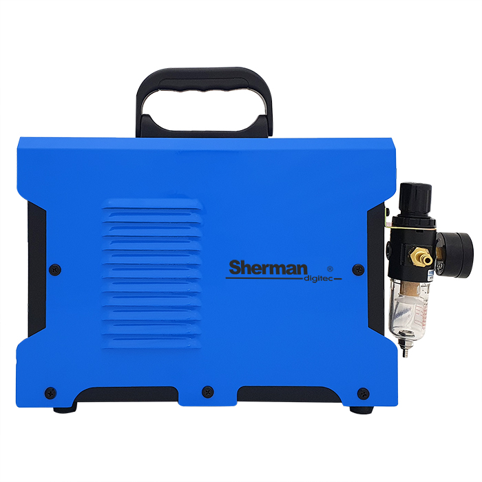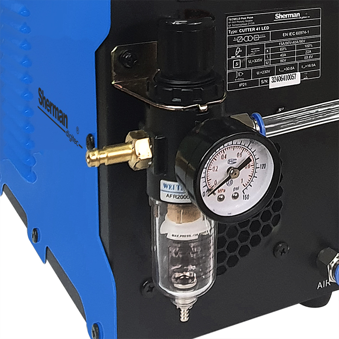Przecinarka wyposażona jest w uchwyt plazmowy 4 m z zajarzaniem HF oraz zespół przygotowania powietrza z reduktorem umożliwiający regulację i kontrolę ciśnienia powietrza.