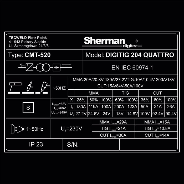 Inwertor IGBT, prąd spawania 200A (60%), max. grubość cięcia 12 mm, zasilanie AC 230V 50Hz, MMA, TIG HF DC, Cold Welding, cięcie plazmowe, puls, sterowanie cyfrowe