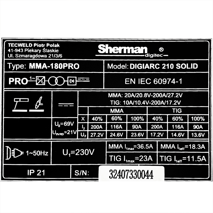 DIGIARC 210 SOLID służy do spawania stali konstrukcyjnych elektrodami otulonymi (metoda MMA). Po zastosowaniu dodatkowego uchwytu umożliwia również spawanie metodą TIG z zajarzeniem łuku przez potarcie (TIG Lift). Jest to urządzenie inwertorowe, produkowane z najbardziej zaawansowanych technologicznie podzespołów wykonanych w technologii IGBT sterowane cyfrowo. Spawarka jest wyposażona w regulowane funkcje: Hot Start – ułatwiającą zajarzanie łuku, Arc Force – służącą do regulacji dynamiki łuku spawalniczego oraz Anti Stick – automatyczną funkcję ułatwiającą oderwanie elektrody w przypadku jej przyklejenia oraz zabezpieczającą przed uszkodzeniem urządzenia i VRD – obniżającą napięcie w stanie bez obciążenia. Małe wymiary, niska waga i naramienny pasek transportowy sprawiają, że przemieszczanie spawarki jest wyjątkowo łatwe i wygodne.