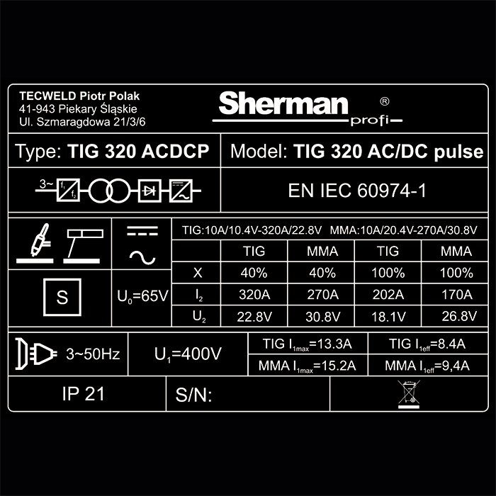 Inwertor IGBT, prąd spawania 320A (40%), zasilanie AC 3x400V 50Hz, TIG AC/DC, MMA.