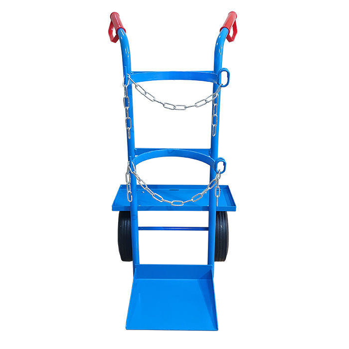 Wózek jednobutlowy z półką przeznaczony jest do transportu butli z gazami technicznymi o pojemności od 8 do 50l. Wyposażony jest w półkę i pasy mocujące o regulowanej długości umożliwiające bezpieczne przewożenie spawarki lub innych akcesoriów spawalniczych.