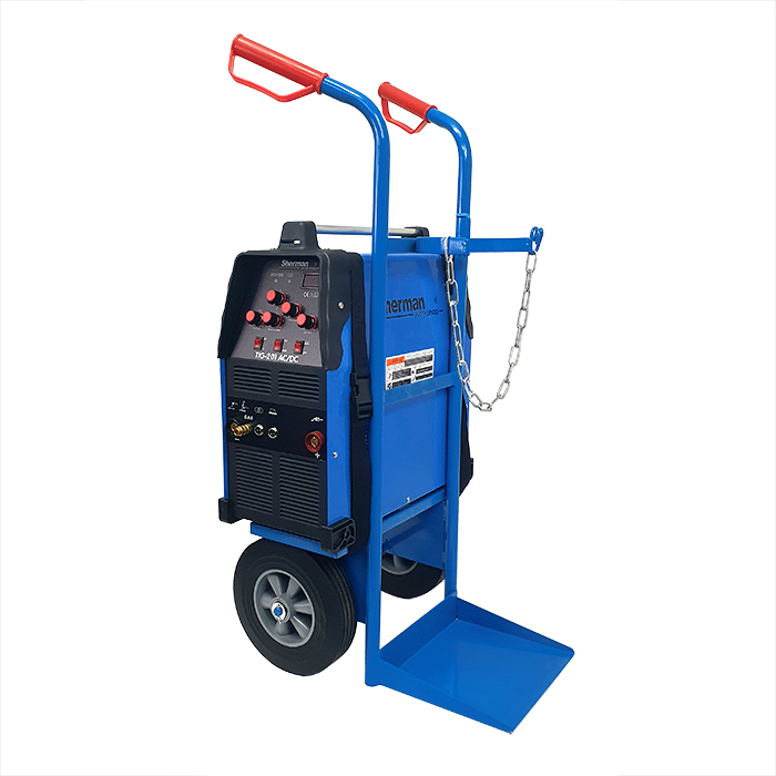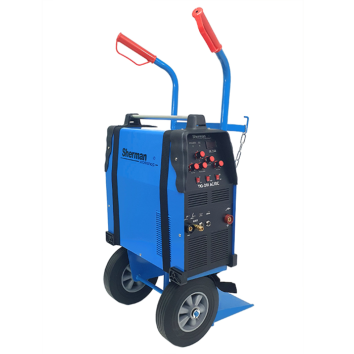 Spawarka TIG 201ACDC Sherman-workshop jest urządzeniem do spawania ręcznego prądem stałym oraz przemiennym metodą TIG oraz elektrodą otuloną (metoda MMA) stali i aluminium. Urządzenie posiada bezstykowe zajarzanie jonizacyjne, regulację opadania prądu, regulację czasu przyspieszenia i opóźnienia wypływu gazu, funkcję czyszczenia elektrody