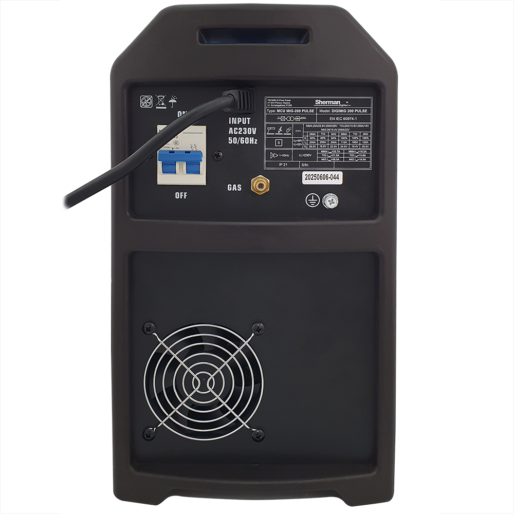 Synergiczny inwertor IGBT, prąd spawania 200A (60%), sterowanie cyfrowe, zasilanie AC 230V 50Hz, MIG, MMA, Lift TIG, puls, podwójny puls.