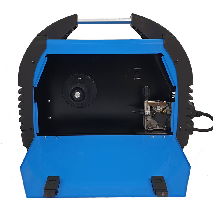 Urządzenie umożliwia podłączenie uchwytu typu Spool Gun (SG) z zamontowanym w nim mini podajnikiem drutu i szpulą D100 drutu stalowego lub kolorowego.