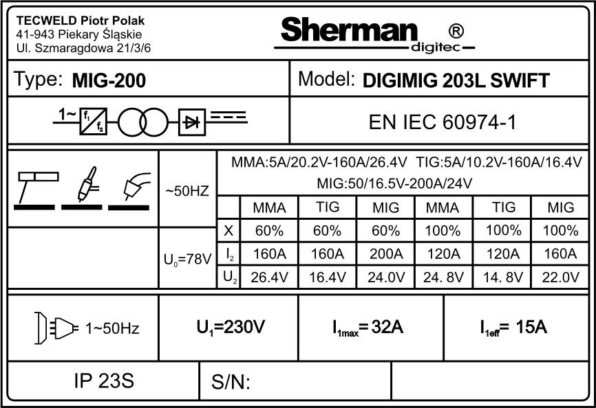 | Max pobór prądu TIG [A] | 32 |