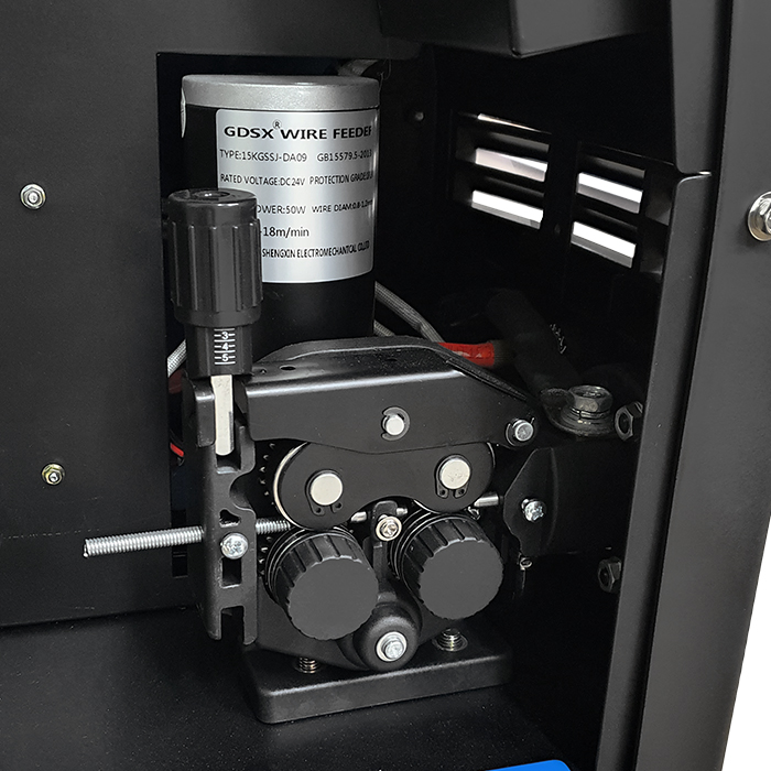 Spawarka wyposażona jest w profesjonalny 4-rolkowy podajnik drutu z płynną regulacją prędkości posuwu.