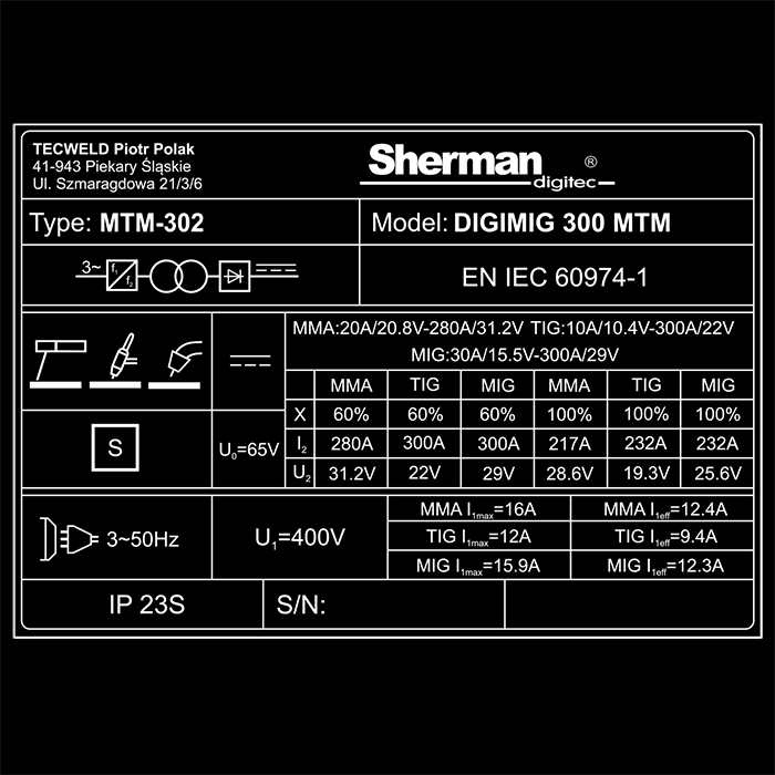 | Max pobór mocy TIG [kVA] | 8,3 |