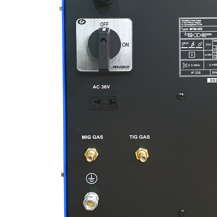 | Funkcje | 2T/4T, Arc Force, Gniazdo zasilania AC 36 V, Hot Start, Mikrokontroler (MCU), Narastanie prądu, Opadanie prądu, Pamięć ustawień, Podajnik 4-rolkowy, Powypływ gazu MIG, Powypływ gazu TIG, Przedwypływ gazu, Puls TIG, Regulacja indukcyjności, Spawanie bez gazu, Spawanie punktowe MIG, Sterowanie cyfrowe, Synergia stal węglowa, Szybki wysuw drutu, Upalanie drutu, Ustawienia manualne, VRD, Wyświetlacz LED |