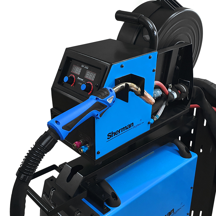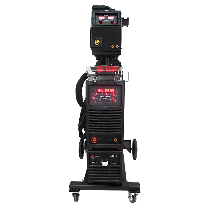 W komplecie znajdują się uchwyt MIG chłodzony cieczą, przewód elektrodowy, przewód masowy, przewód zespolony o długość 4,8m oraz zestaw rolek do stali i aluminium.