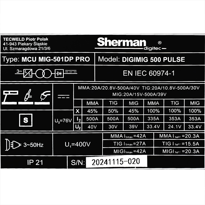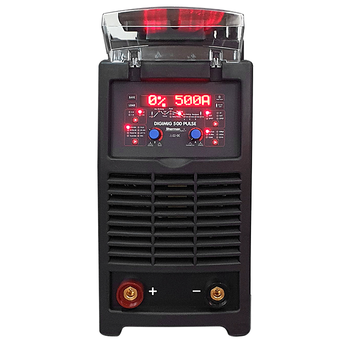 Synergiczny inwertor IGBT, prąd spawania 500A (45%), sterowanie cyfrowe, zasilanie AC 3x400V, MIG, MMA, TIG Lift, lutospawanie, podwójny puls, wyświetlacz LED