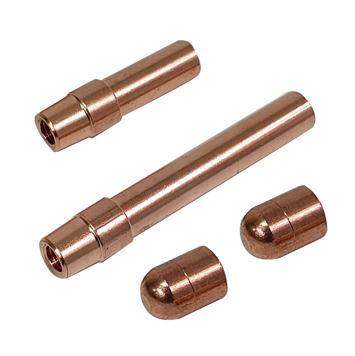Zestaw elektrod i kap (końcówek) do zgrzewarki F30. W komplecie znajdują się: