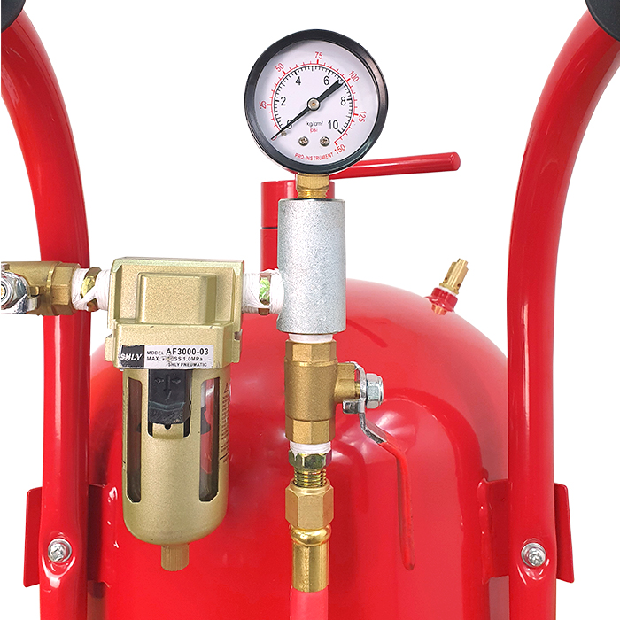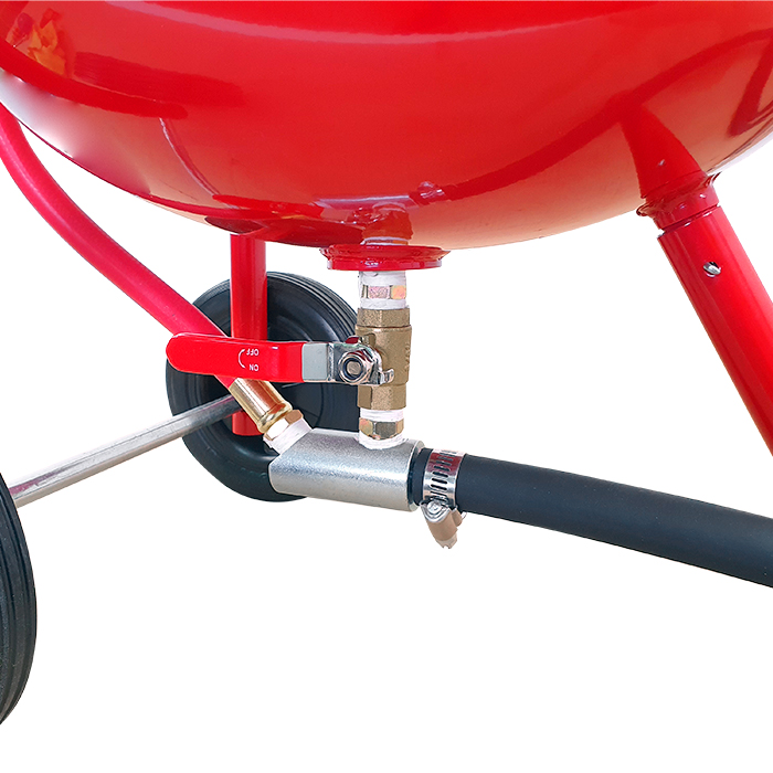 Piaskarka wyposażona jest w uchwyt prowadzący oraz dwa kółka, które ułatwiają transport oraz manewrowanie. Urządzenie posiada również stopkę.