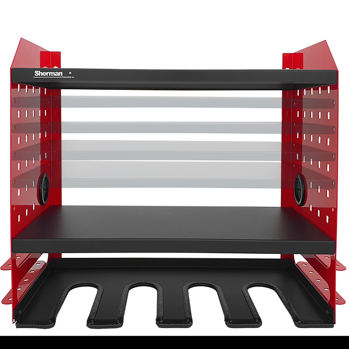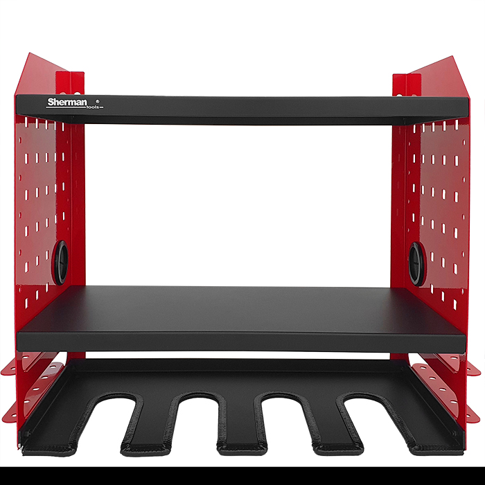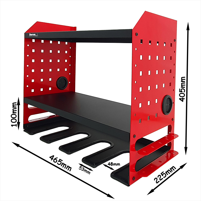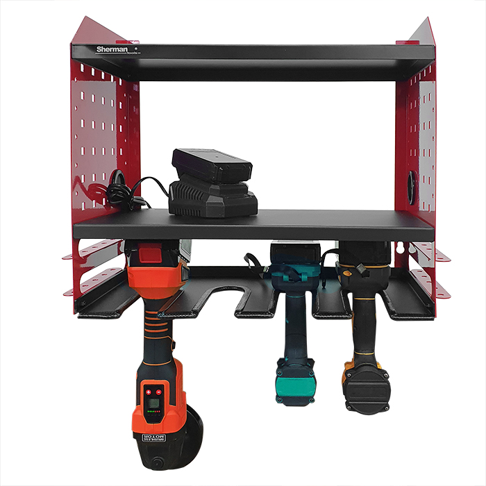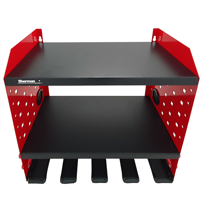 Szafka wisząca na elektronarzędzia 4M Sherman, idealnie sprawdzi się w warsztatach, serwisach oraz garażach. Wyposażona w dwie półki, cztery miejsca na elektronarzędzia oraz dwa uchwyty na wkrętaki. Solidna półka z możliwością montażu na ścianie, dzięki której już zawsze będziesz miał pod ręką swoje narzędzia.