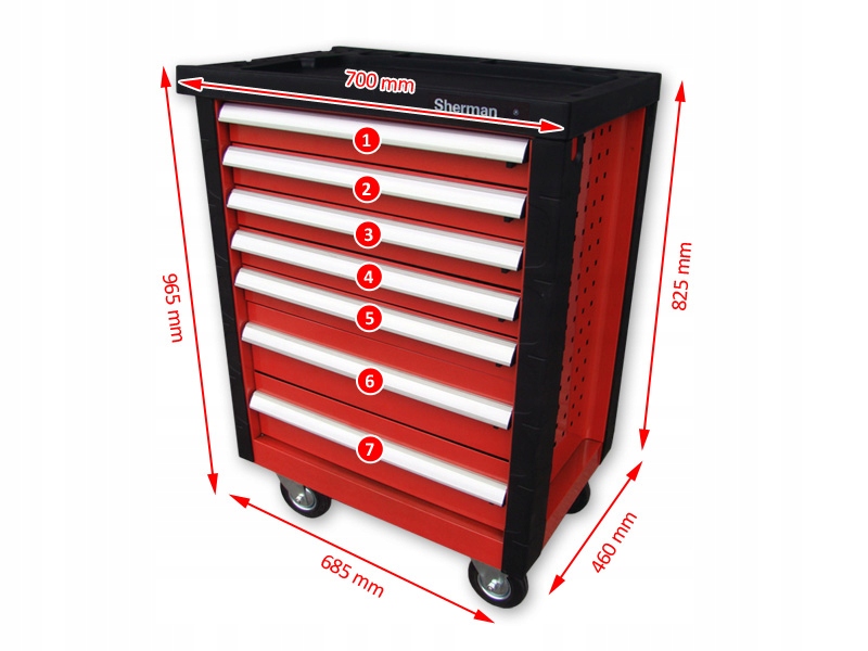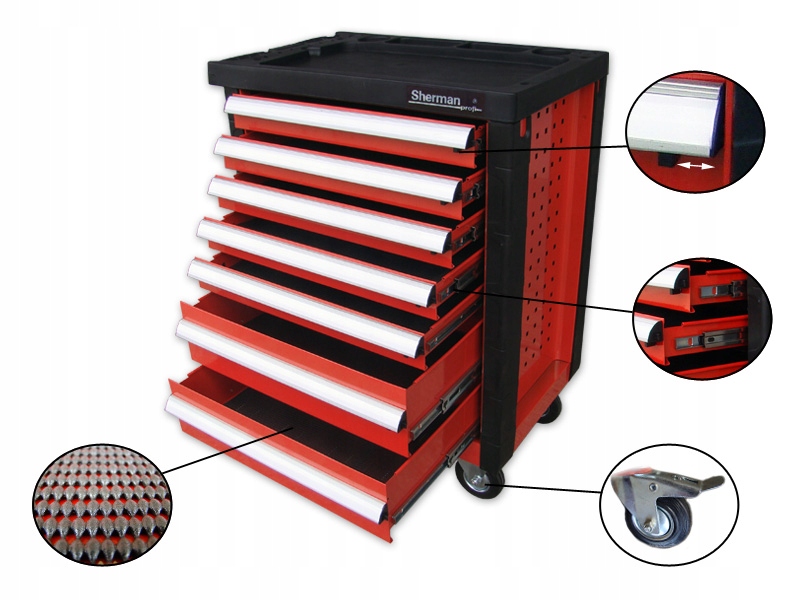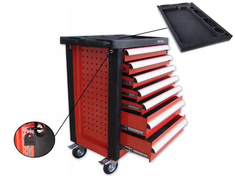Stalowy wózek z siedmioma wysuwanymi szufladami na łożyskach rolkowych. Posiada dwa skrętne koła z hamulcem oraz naroża i blat roboczy wykonany z tworzywa sztucznego. Wózek wyposażony jest w mechanizm pozwalający równocześnie zamknąć na zamek wszystkie szuflady. Dodatkowo każda szuflada posiada mechanizm blokujący, zabezpieczający ją np. przed przypadkowym otwarciem. Świetnie sprawdza się w warsztatach, serwisach, garażach.