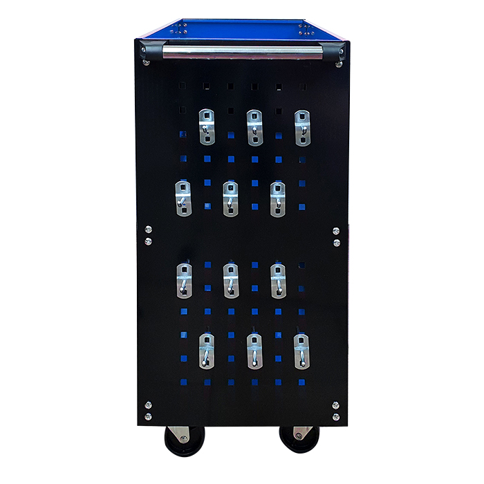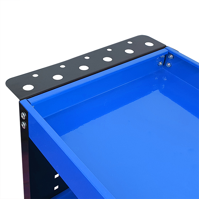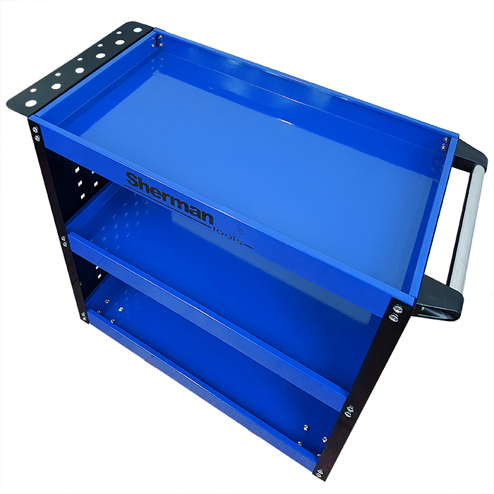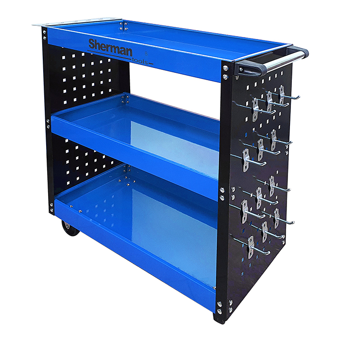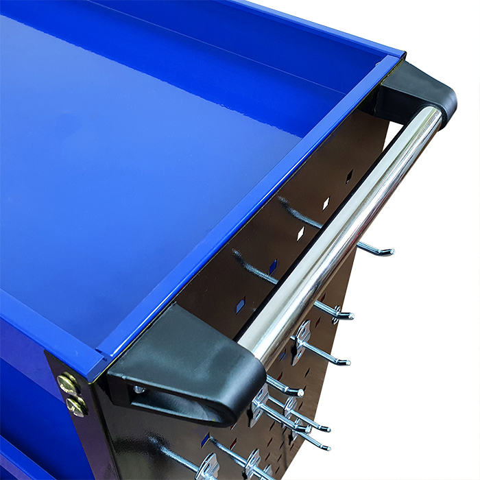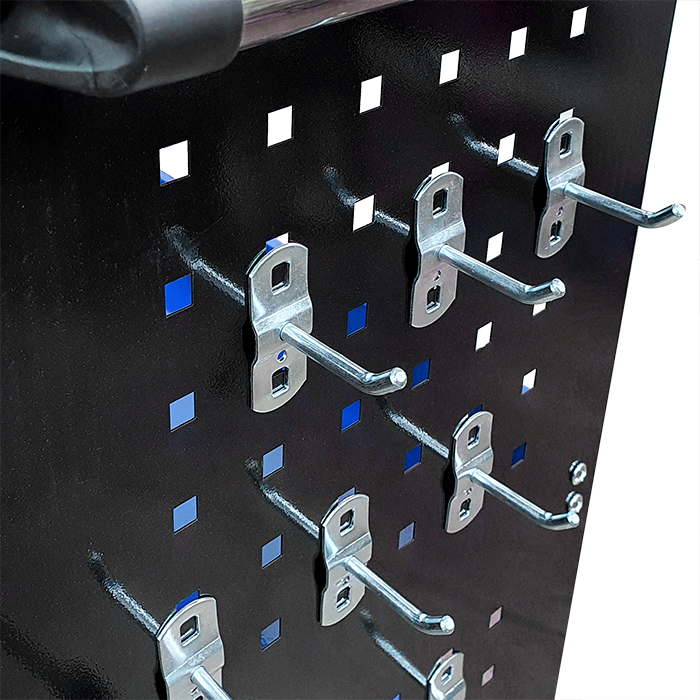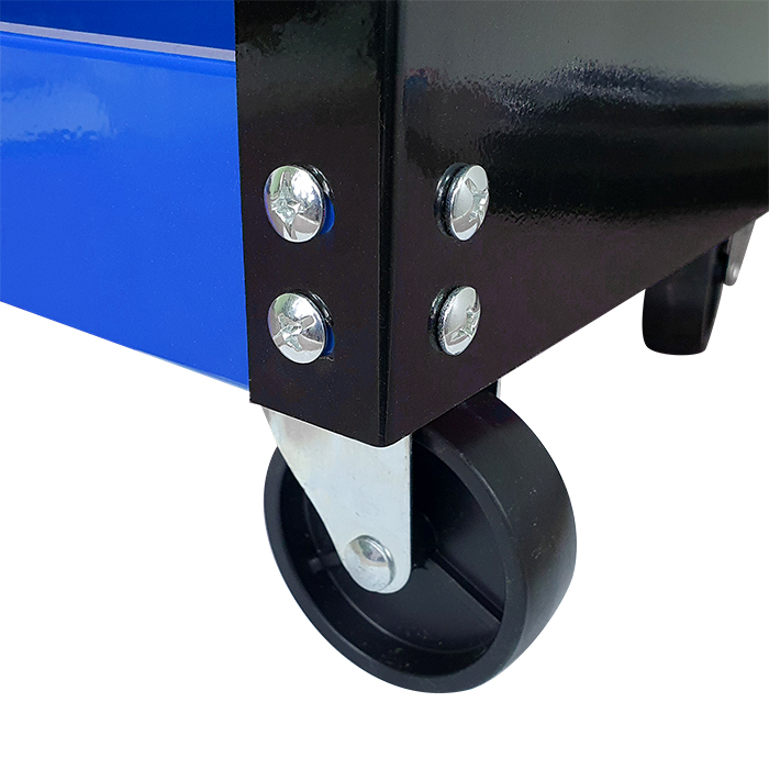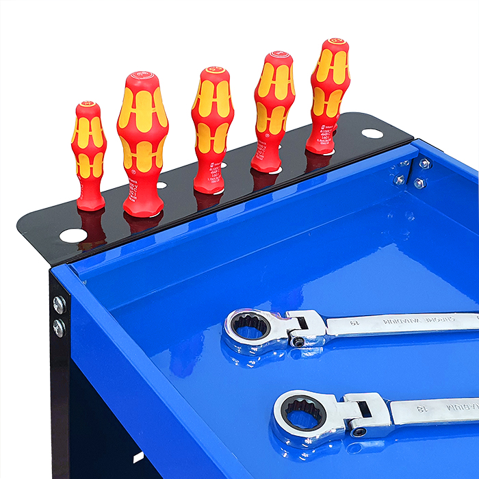 Świetnie sprawdzi się w warsztatach i serwisach oraz garażach. Wyposażony w podręczny uchwyt na wkrętaki, boczne ścianki z haczykami na narzędzia oraz metalową rączkę ułatwiającą manewrowanie. Posiada cztery kółka, w tym dwa skrętne.