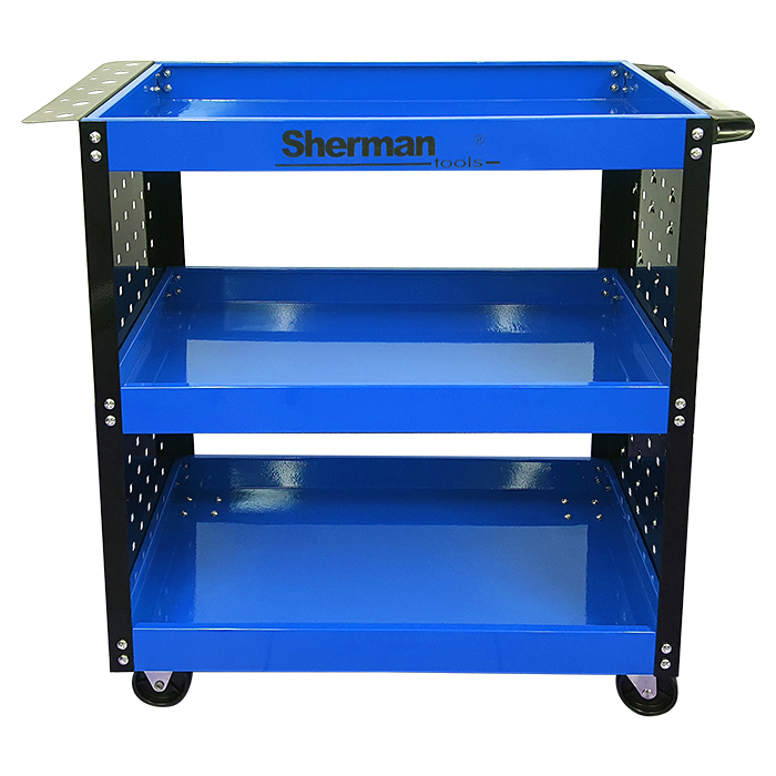 Stalowy wózek z trzema głębokimi półkami do przechowywania narzędzi oraz transportu niedużych paczek.